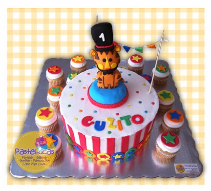 Ahora el pequeño Gus iba a cumplir un año, el tema de la fiesta era el circo, Karla me mandó una foto con el kit de platos, vasos y servilletas para la fiesta para que hiciera el tigre en 3D para el pastel, y asi quedó.